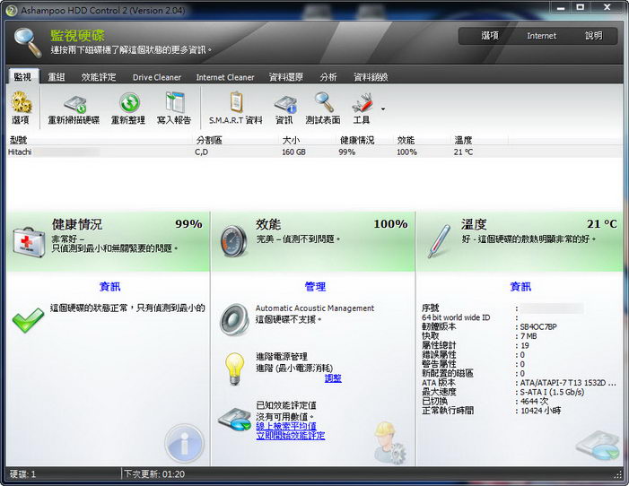 Ashampoo HDD Control 2.04 硬碟工具軟體 具有監視、重組、效能評定、清理、還原等多項實用功能! 繁體中文破解版